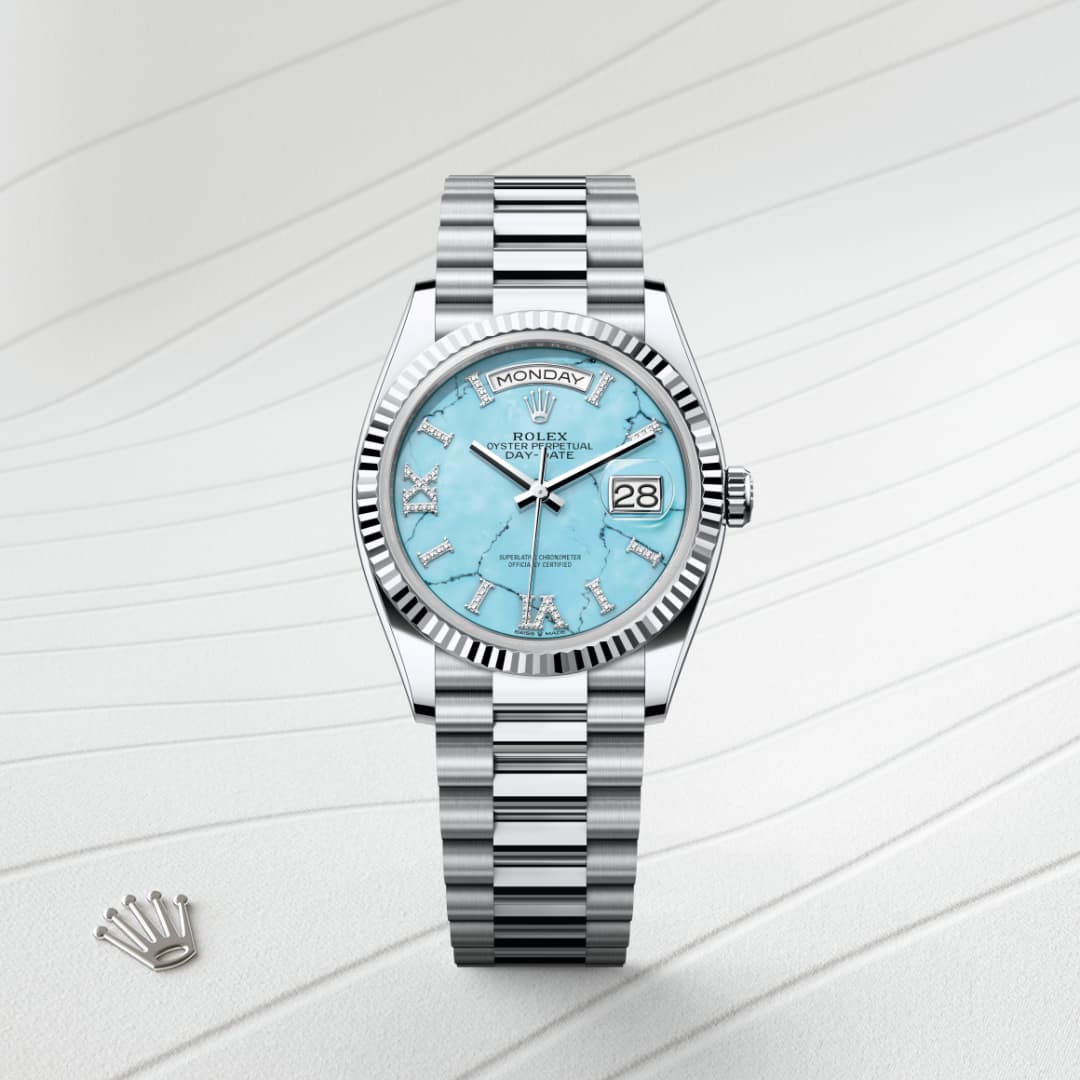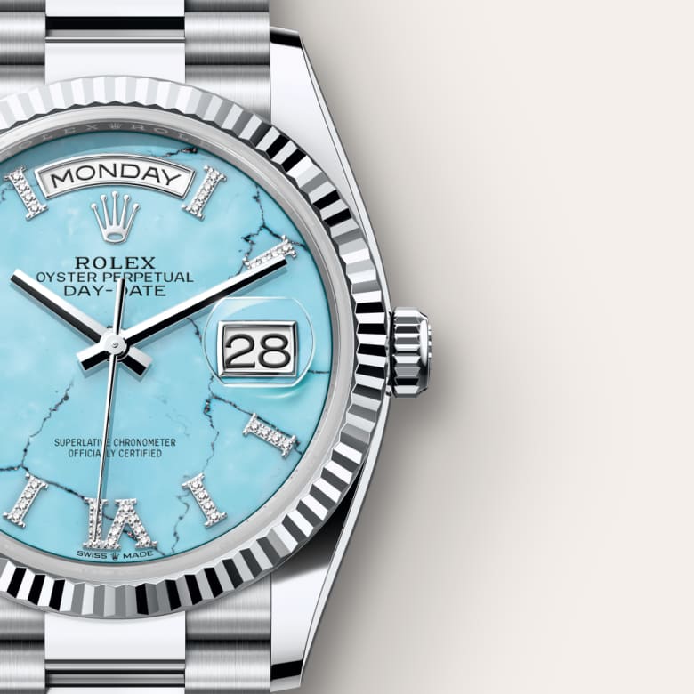 This dial features hour markers in 18 ct gold, set with 32 diamonds, and a Roman VI and IX in 18 ct gold, set with 24 diamonds. Only found in a few places on Earth, turquoise has been prized for thousands of years for its special hue. Rolex selects turquoise for the beauty of its structure and its characteristic, rare blue colour, because it marries perfectly with yellow and white gold. It is exclusively reserved for gold or platinum versions of the Day-Date 36.