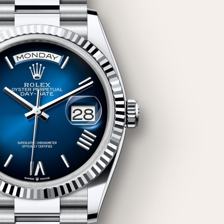 The Rolex fluted bezel is a mark of distinction. Originally, the fluting of the Oyster bezel had a functional purpose: it served to screw the bezel onto the case helping to ensure the waterproofness of the watch. It was therefore identical to the fluting on the case back, which was also screwed onto the case for waterproofness, using specific Rolex tools. Over time, the fluting became an aesthetic element, a genuine Rolex signature feature. Today the fluted bezel is a mark of distinction, in platinum on this Day-Date 36.