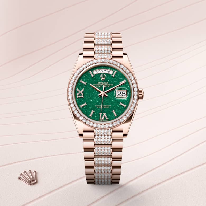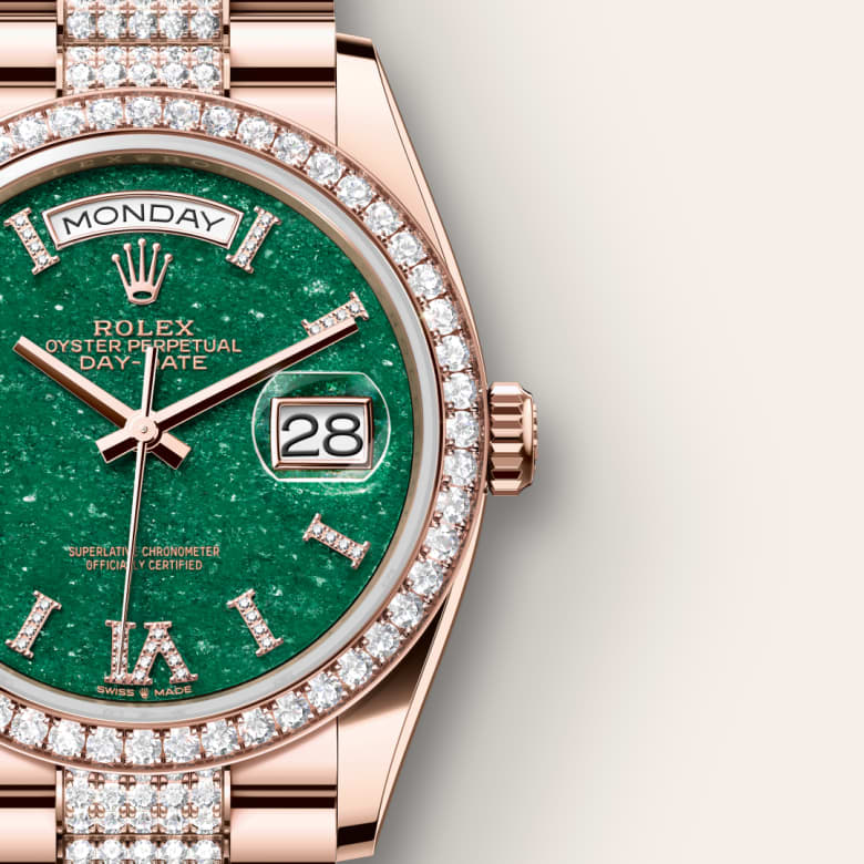 This dial features hour markers in 18 ct gold, set with 32 diamonds, and a Roman VI and IX in 18 ct gold, set with 24 diamonds. It is cut from green aventurine, a stone with a finely crystallized surface.The dial is the distinctive face of a Rolex watch, the feature most responsible for its identity and readability. Characterised by hour markers fashioned from gold to prevent tarnishing, every Rolex dial is designed and manufactured in-house, largely by hand to ensure perfection.