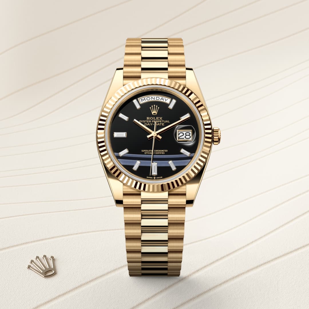 The Rolex fluted bezel is a mark of distinction. Originally, the fluting of the Oyster bezel had a functional purpose: it served to screw the bezel onto the case helping to ensure the waterproofness of the watch. It was therefore identical to the fluting on the case back, which was also screwed onto the case for waterproofness, using specific Rolex tools. Over time, the fluting became an aesthetic element, a genuine Rolex signature feature. Today the fluted bezel is a mark of distinction, in gold on this Day-Date 40.
