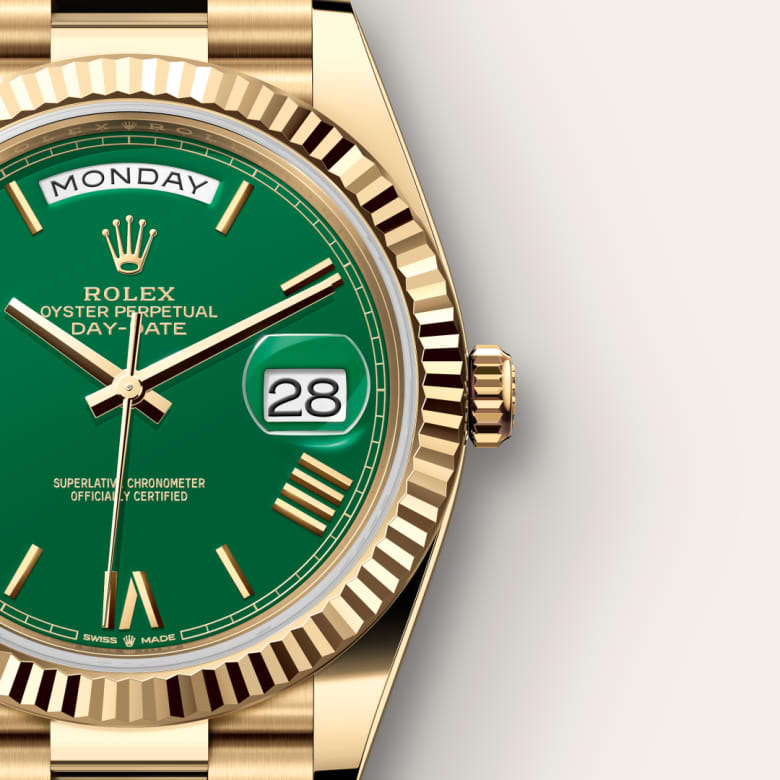 The Rolex fluted bezel is a mark of distinction. Originally, the fluting of the Oyster bezel had a functional purpose: it served to screw the bezel onto the case helping to ensure the waterproofness of the watch. It was therefore identical to the fluting on the case back, which was also screwed onto the case for waterproofness, using specific Rolex tools. Over time, the fluting became an aesthetic element, a genuine Rolex signature feature. Today the fluted bezel is a mark of distinction, in gold on this Day-Date 40.