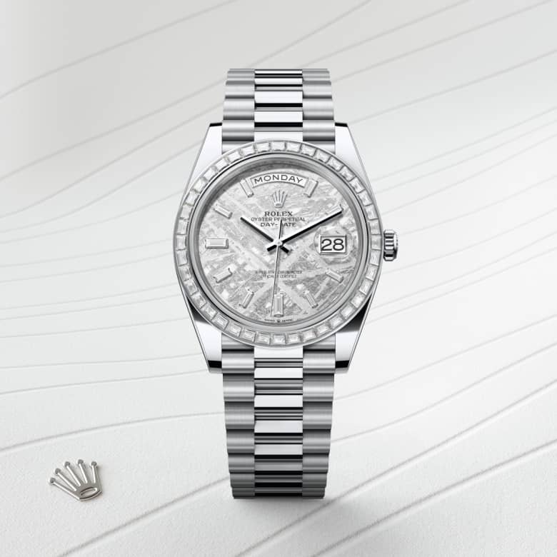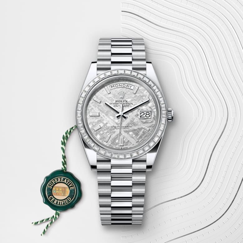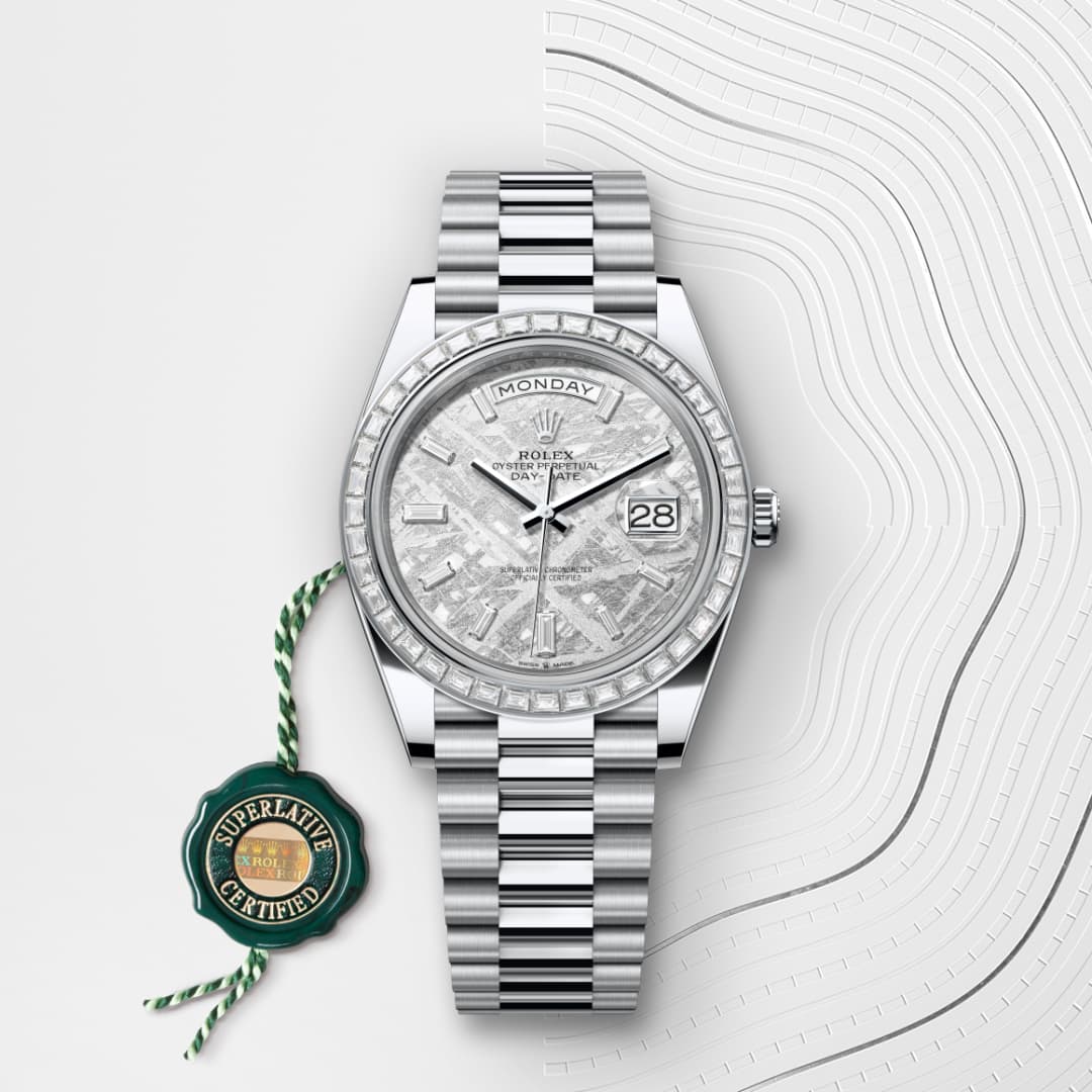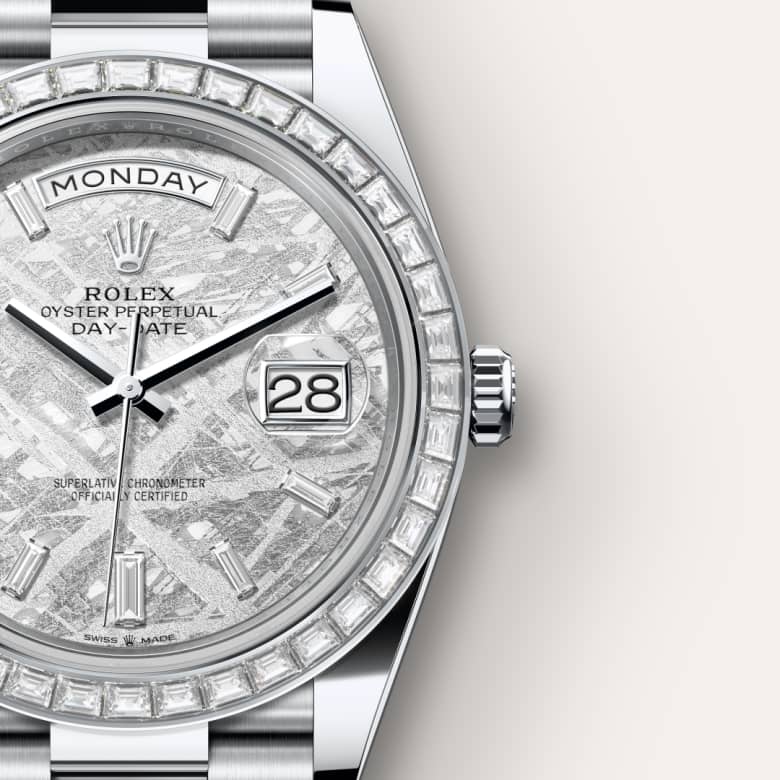 This dial features 10 baguette-cut diamonds. Formed in the far reaches of the solar system, metallic meteorite comes from an asteroid that exploded millions of years ago. On the voyage between planets, fragments of this natural extraterrestrial material, primarily composed of iron and nickel, cool by a few degrees Celsius every million years, creating unique, distinctive crystallization within the material that is impossible to recreate on Earth. Metallic meteorite is rare and challenging to work with, but once it is cut into thin sections and a chemical treatment is applied, the great beauty of its interwoven internal structure is revealed. These fascinating and varied formations are known as Widmanstätten patterns. For its dials, Rolex works with leading experts in the field and selects only the sections of meteorite with a particularly well-formed surface rich in different shapes and reflections.