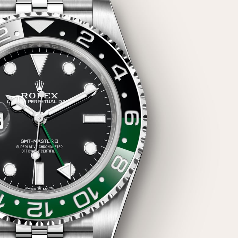 Este modelo presenta una esfera negra y un disco de bisel Cerachrom bicolor en cerámica verde y negra bicolor. El GMT‑Master II dispone de una aguja adicional que da la vuelta a la esfera en 24 horas y complementa a las tradicionales agujas de las horas, minutos y segundos, así como de un bisel giratorio bidireccional graduado 24 horas. La aguja adicional de 24 horas, con su color distintivo, indica la hora de referencia, la del lugar de residencia, en un primer huso horario que se lee sobre la graduación del bisel. La hora local del viajero puede ajustarse fácilmente mediante saltos de hora en hora gracias a un astuto mecanismo controlado por la corona: la aguja de las horas puede ajustarse hacia delante o hacia atrás, de forma independiente del minutero y el segundero. Esto permite al viajero adaptar su nuevo huso horario sin que afecte a la precisión. El disco de bisel Cerachrom, por su parte, presenta una combinación inédita de colores: un negro y un verde exclusivo de este modelo.